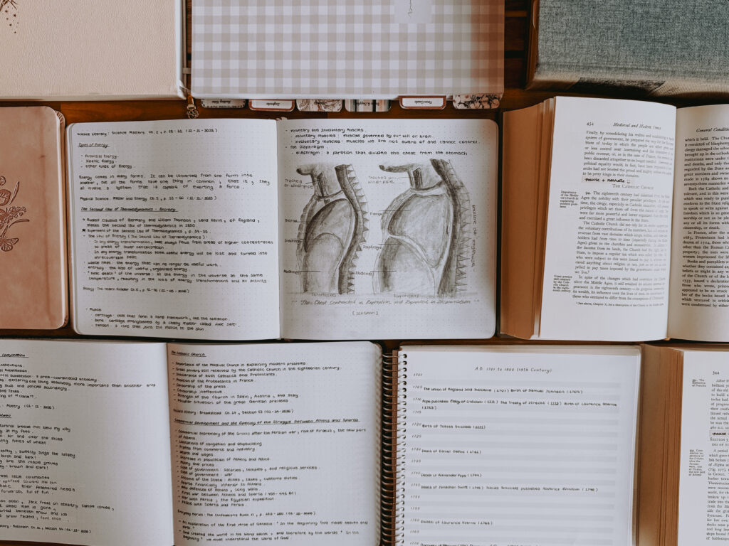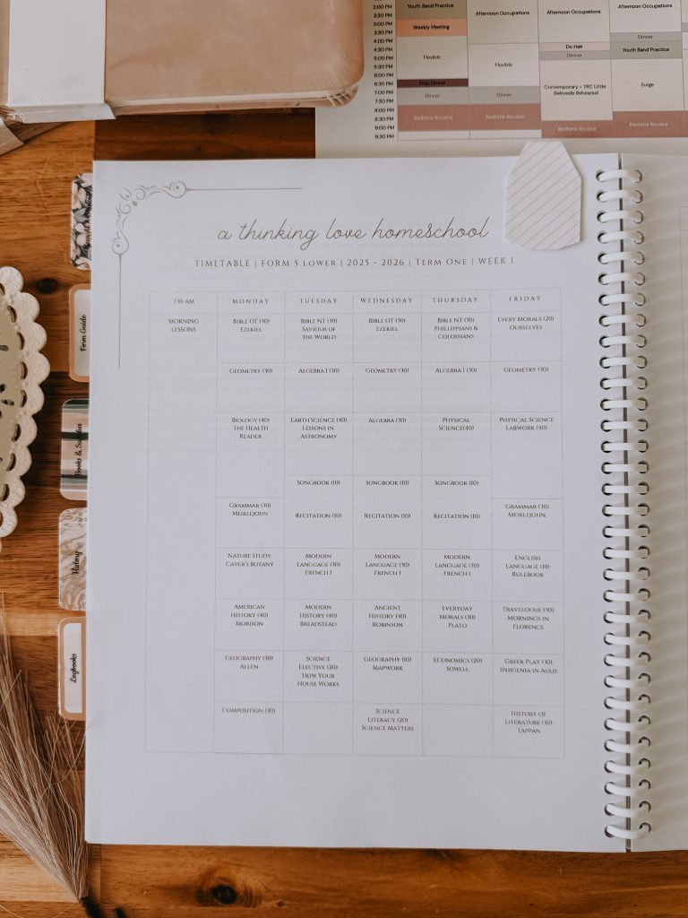 I have come to realize that in order to lay a wide and generous feast of knowledge for my high schooler — short morning lessons and no homework after school — one must practice the habit of attention and set good boundaries for deep work. For us, it means that we are homebound in the morning, with minimal distractions and talking (which is still a work-in-progress for our chatty family of 5). I do my best not to schedule anything outside of home during our morning lessons, and prioritize my availability for my teen during her consultation block. She also does her best to adhere to her assigned blocks using a timer, to bring back her awareness of time (again, a work-in-progress). Her school schedule is well-planned but fluid. There are days when time is limited for morning lessons and she can only accomplish the essentials. There are days when much can be accomplished in certain subjects. All “deviations” from her timetable and planned work are recorded in her logbook, so that we can review and reflect at the end of the week/term.